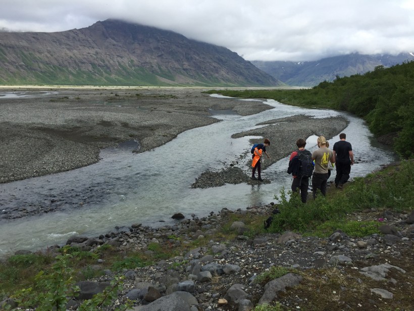 Today (and yesterday) we were clearing lupins from near the Morsá river in the National Park. To get to today’s section we had an hour long hike along the river valley followed by a crossing of 5 strands of the river to get to an island covered in lupins. The river was quite fast flowing but relatively shallow, sadly not shallow enough for boots. Being the city dwelling, desk bound type that I am means my feet are not hardened to temperature or surface. Wading ankle and knee deep in glacial meltwater is not fun and to be honest I did not handle (footle?) it well.