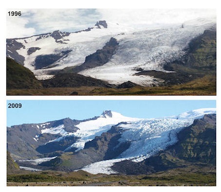The Virkisjökull glacier, which flows from the highest mountain in Iceland — the Öraefajökull ice cap in 1996 and 2009. In the last 15 years it is estimated that almost 500 m of horizontal recession and 50m of vertical thinning has taken place at this glacier. To put this in perspective, the glacier has only retreated around 1km and thinned about 50m in the previous 100 years combined.